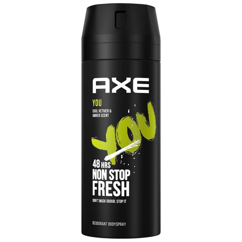 Axe deodorantti bodyspray You on moderni tuoksu, missä yhdistyy basilika, mustapippuri sekä aavistus meripihkaa ja kanelia. Axe bodyspray 150 ml pitää olon raikkaana jopa 48 tuntia ja myös tuoksu kestää iholla pitkään.