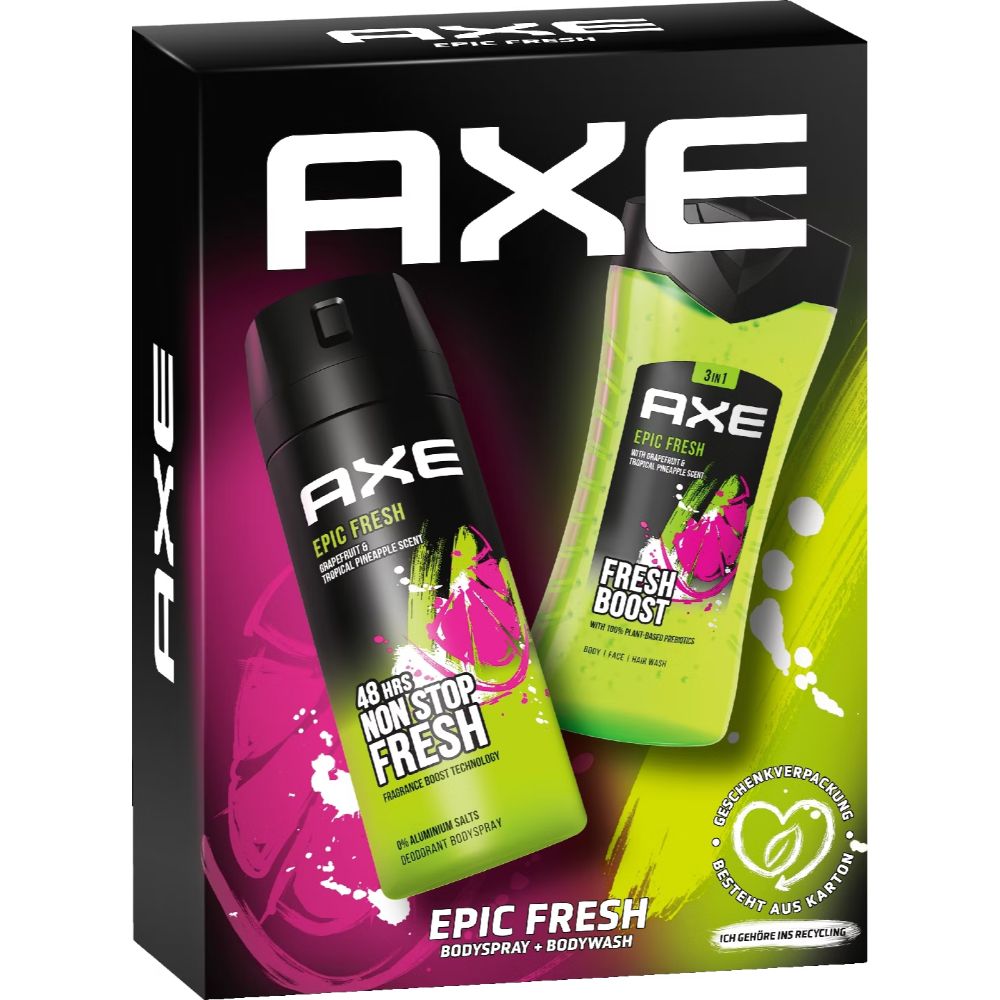 - Sisältää: Axe Epic Fresh suihkusaippua 250 ml ja Axe Epic Fresh antiperspirantti suihkedeodorantti 150 ml