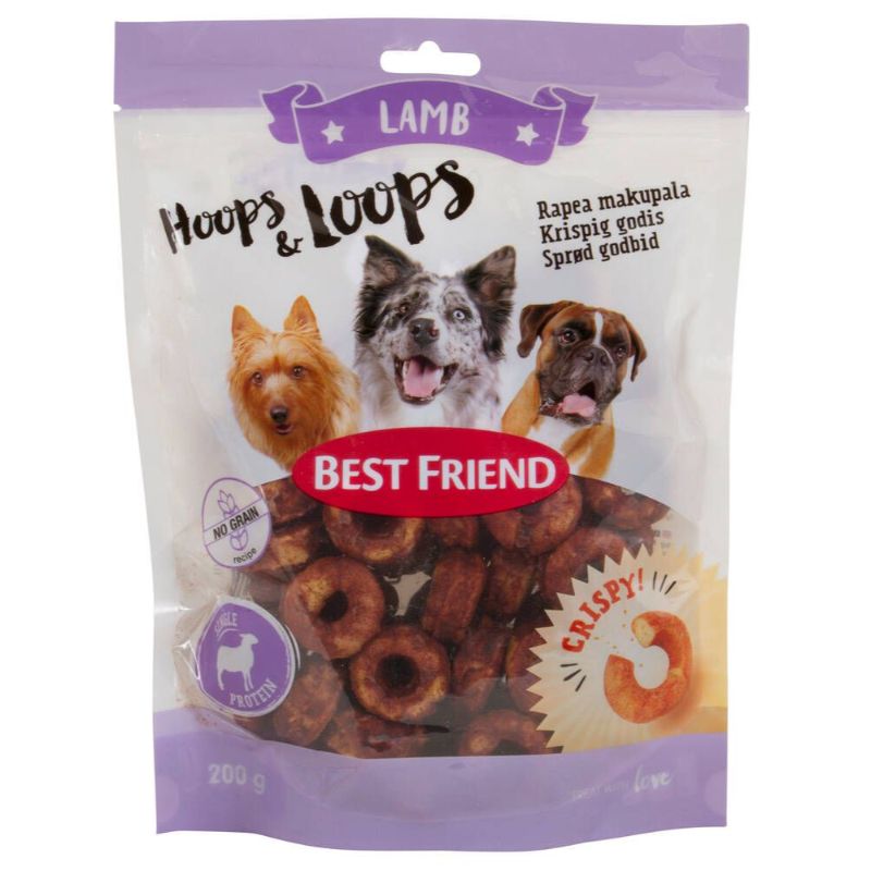 Best Friend Hoops & Loops herkut ovat täydellisiä päivittäiseen hemmotteluun ja palkitsemiseen. Rapean ja maukkaan koostumuksen pääosassa on vähärasvainen lammas, joka on myös ainoa eläinproteiinin lähde. Täysin viljaton resepti sisältää lisäksi reilusti kuiturikasta bataattia ja perunaa. Valmistuksessa ei ole käytetty keinotekoisia väri-, maku- tai säilöntäaineita.