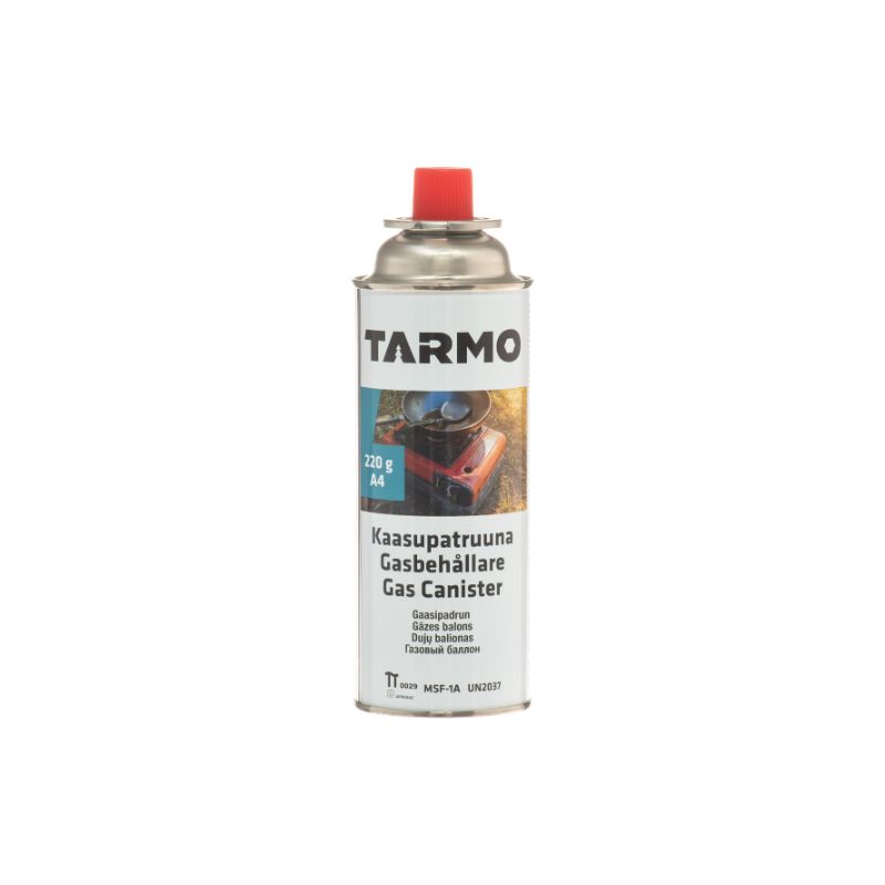 Kaasupatruuna A4. Yleiskaasu lämmittimiin ja keittimiin, kaasutohoon ym. Painoventtiili. Butaani-propaani-kaasuseos.