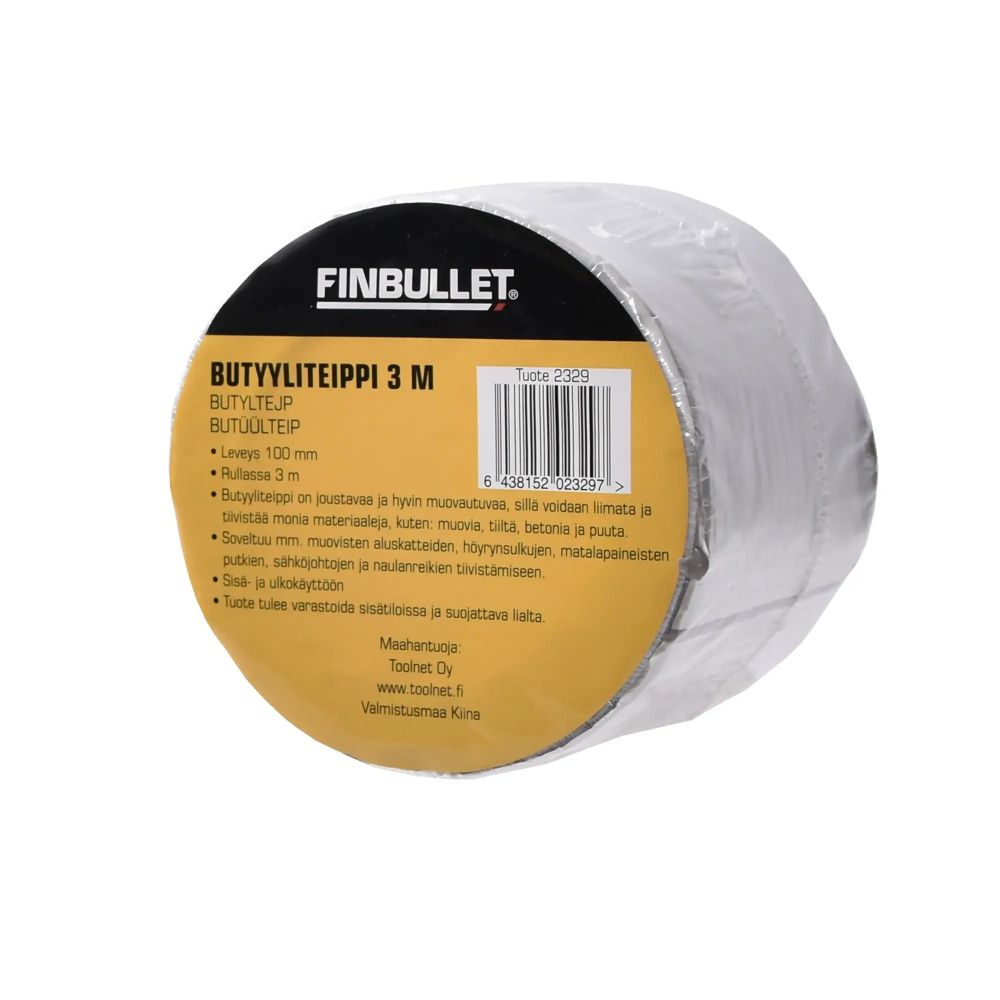 Finbullet butyyliteippi on joustavaa ja hyvin muovautuva. Sillä voidaan liimata ja tiivistää materiaaleja kuten muovia, tiiltä, betonia ja puuta. Butyyliteippi soveltuu esimerkiksi muovisten aluskatteiden, höyrynsulkujen, matalapaineisten putkisähköjohtojen ja naulanreikien tiivistämiseen. Sopii sisä- ja ulkokäyttöön. Tuote varastoidaan sisätiloissa lialta suojattuna.