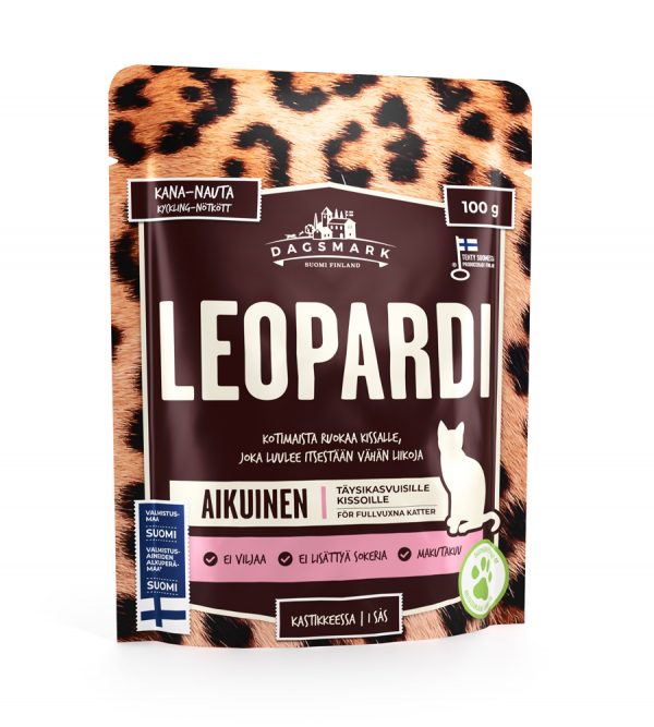 Dagsmark LEOPARDI -märkäruoassa on maukas ja proteiinipitoinen kotimaista kanaa ja nautaa sisältävä koostumus. Märkäruoka ei sisällä viljaa, soijaa, lisättyä sokeria eikä säilöntä- tai väriaineita. Dagsmark LEOPARDI tukee kissasi hyvinvointia ja maistuu ihan makutakuulla.