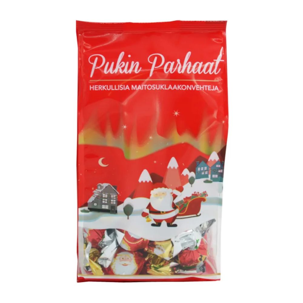 Maitosuklaakonvehteja joulupukkikuvioisissa kääreissä ja pussissa.