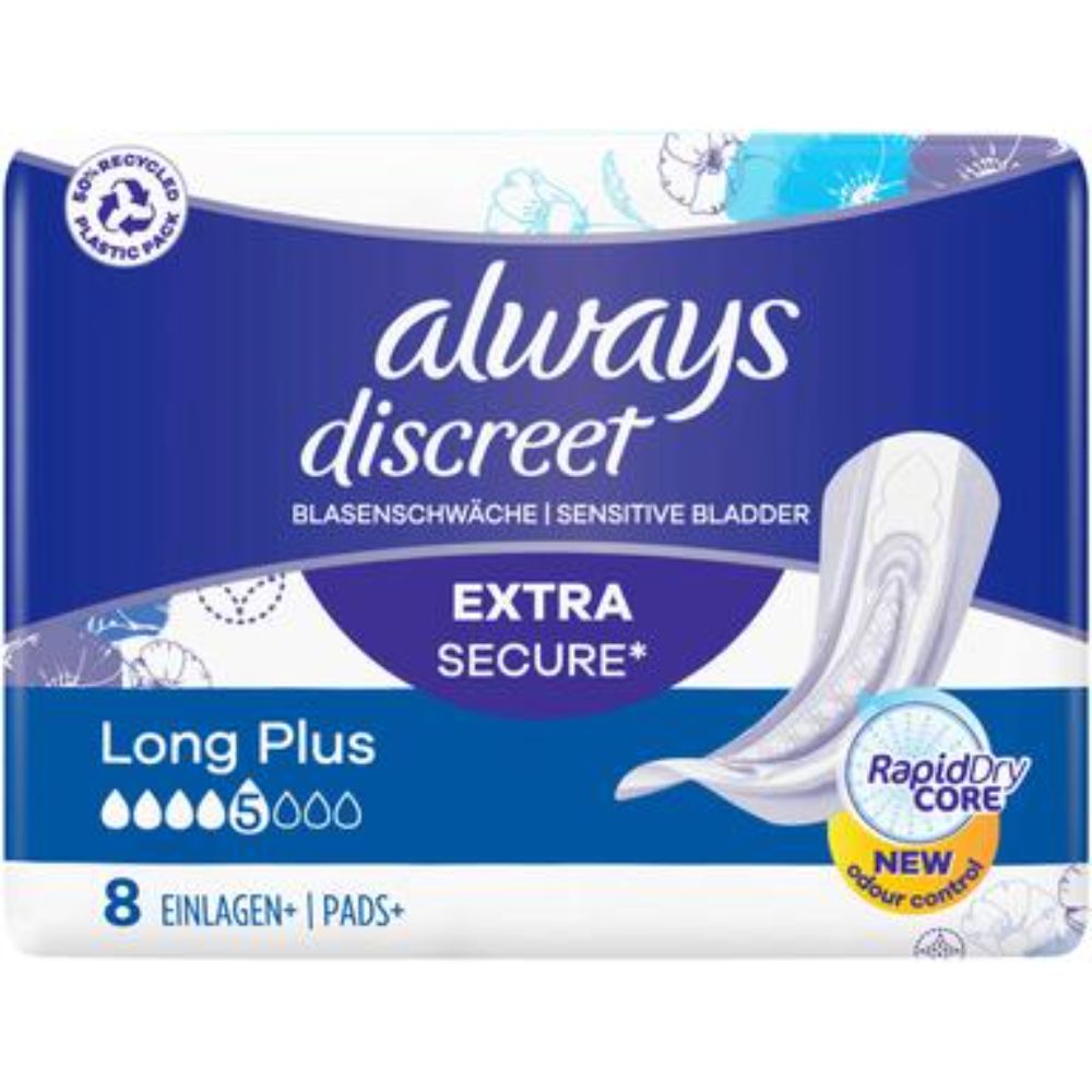 Always Discreet Long Plus -inkontinenssisuojat ovat ihanteelliset runsaaseen virtsankarkailuun ja antavat erittäin luotettavaa suojaa, jota tuskin tunnet. Suoja pysyy mukavasti paikallaan ja on huomaamaton vaatteiden alla. Niiden ainutlaatuisen, äärimmäisen ohuen ytimen kaksi suojaavaa kerrosta muuttavat nesteen geeliksi lukiten sen sisäänsä, minkä ansiosta sinun ei tarvitse valita mukavuuden ja suojaavuuden väliltä. Jos aivastaminen tai nauraminen aiheuttaa virtsankarkailua, Always Discreet Long Plus -inkontinenssisuojat antavat ihanteellisen suojan.
