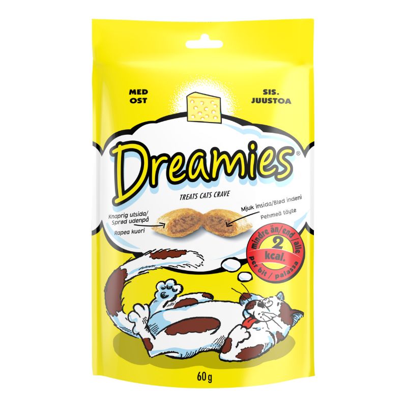 Dreamies- herkkupalojen valmistuksessa ei ole käytetty salaisia ainesosia, vaan makupalat on täytetty maistuvalla sisällöllä, josta kissat tykkäävät. Yhdessä palassa vain 2 kcal. Herkullinen juuston maku.