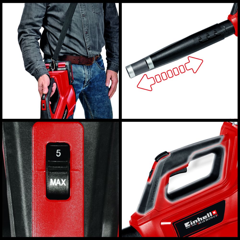 Einhell akkulehtipuhallin GE-LB 36/210 Li E-Solo -akkulehtipuhallin on tehokas lehtipuhallin, joka takaa johdoista vapaan liikkumavapauden pihassa ja puutarhassa. Kevyestä ja kätevästä rakenteestaan huolimatta se on luotettava laite, joka mahdollistaa koko tontin kätevän puhdistamisen viimeistä nurkkaa myöten. Elektronisen kierrosluvunsäädön avulla puhallusteho voidaan mukauttaa tarkasti jokaiseen käyttökohteeseen sopivaksi.