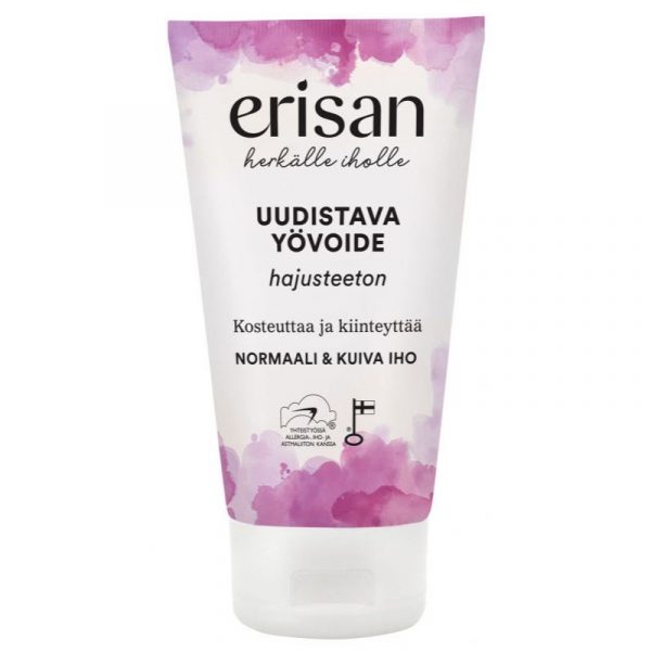 Hajusteeton ja täyteläinen Erisan uudistava yövoide kosteuttaa ja ravitsee herkkää ihoa yöaikaan.