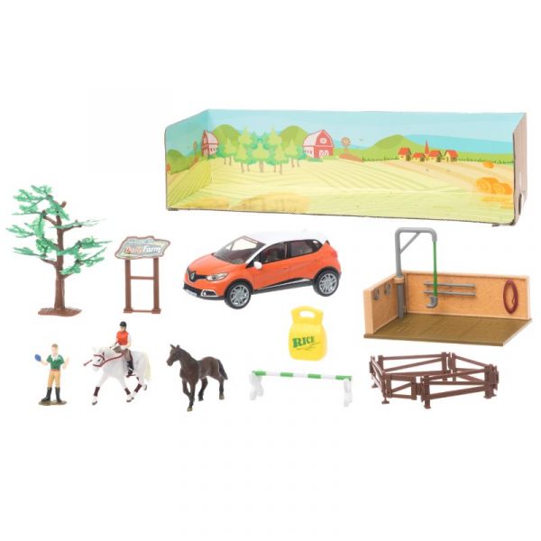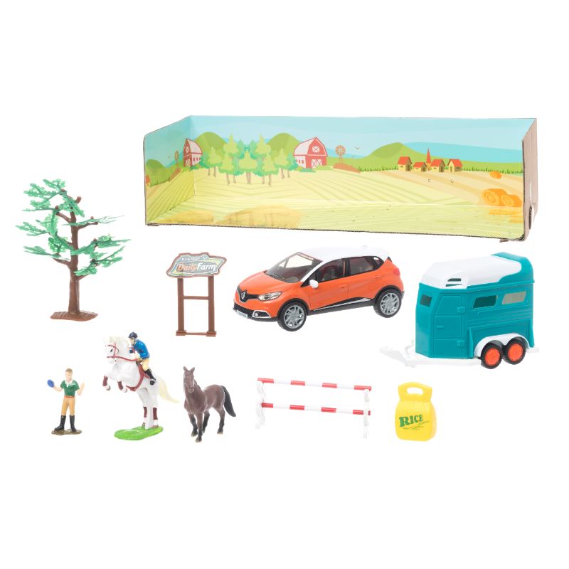 Pakkaus 48 x 15 x 12 cm. Esteratsastusaiheinen leikkisetti, joka sisältää 1:32 koon auton, 2 kpl hevosia ja tarvikkeita. Lajitelmassa 2 erilaista pakkausta. Ikäsuositus 3+