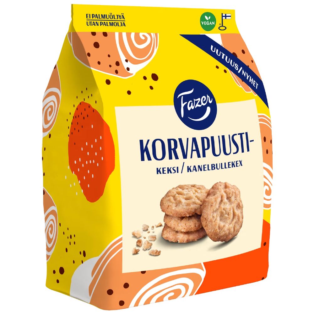 FAZER KORVAPUUSTIKEKSI 270 G Fazer Korvapuustikeksi maistuu tutulta korvapuustilta ja sopii koko perhelle. Keksit leivotaan Suomessa kotimaisesta viljasta ilman palmuöljyä. Keksi on kooltaan sopivan pieni ja se sopii pieneksi makeaksi välipalaksi tai kahvin kanssa.