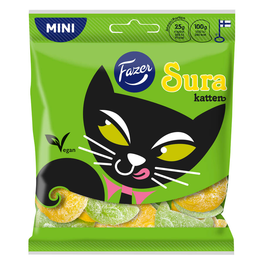 Sura Katten -kissat laajentavat jo tunnetun tuotemerkin makuvalikoimaa. Sitruunan ja limen makuiset Sura Katten -makeiset ovat kirpeän happamia. Sura Katten -makeiset ovat vegaanisia ja sisältävät luontaisia makuaineita. Piristä päivääsi hauskalla minipussilla!