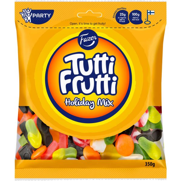 Hedelmäinen Tutti Frutti tuo iloa ja aurinkoa kaikille. Tutti Frutti Holiday Mix vie lomatunnelmiin ja sulkee sisäänsä yksitoista erilaista karkkia, suklaarakeista ja salmiakista eksoottisiin hedelmän makuihin. Iso pussi sopii jaettavaksi isommallekin lomaseurueelle!