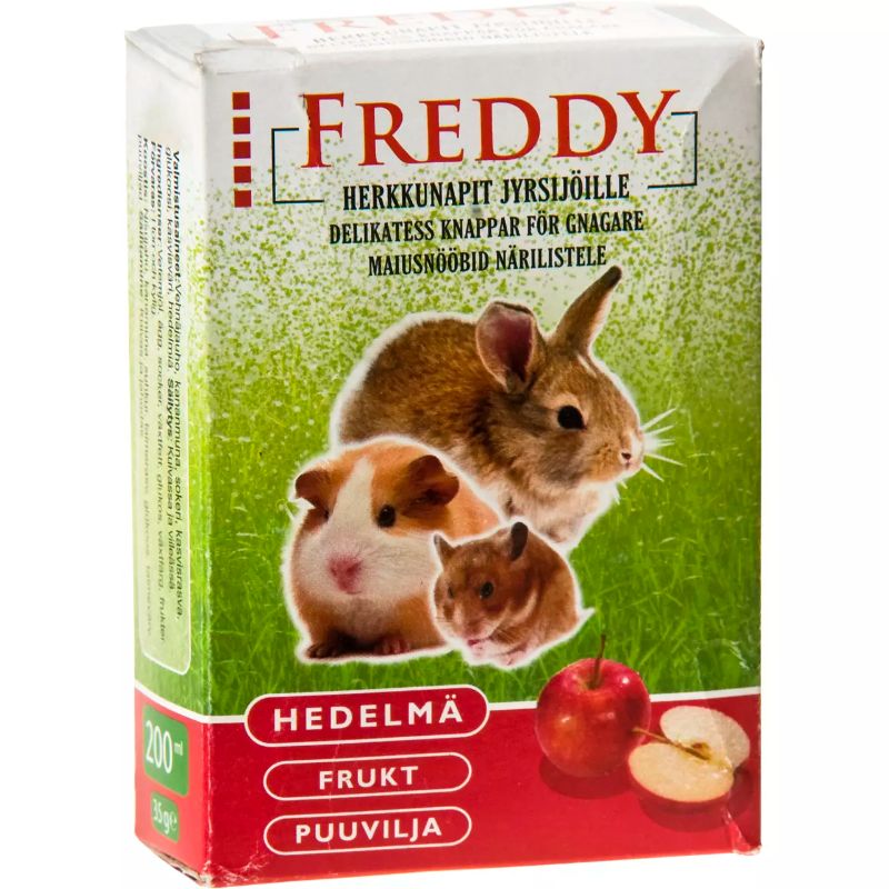- Laadukkaat Freddy jyrsijän herkkunapit ovat terveellisiä ja maistuvia välipaloja lemmikillesi tuoden vaihtelua päivittäiseen ruokavalioon.