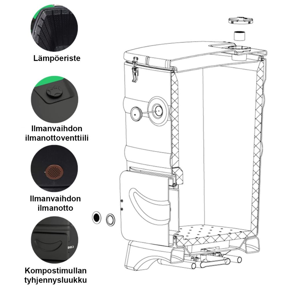 Ympärivuotiseen käyttöön suunniteltu lämpökompostori on varustettu säädettävällä ilmanvaihtoventtiilillä, jota säätämällä voidaan vaikuttaa kompostoitumisprosessiin. Ilmanvaihtoventtiilin avulla voidaan edesauttaa sekä säätää kompostoitumisprosessia tilanteen mukaan. Kotitalousjätteiden kompostointiin tarkoitetun lämpökompostorin sisälämpötilaa ja kompostoitumisen tilaa on helppo seurata kompostorin etupaneelissa olevasta selkeälukuisesta lämpötilamittarista.