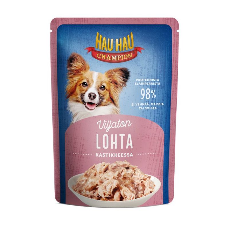 Viljaton Hau-Hau Champion Lohta kastikkeessa -annosateria on lihaisa ja käyttövalmis täysravinto, joka sisältää herkullista kalaa ja reilusti maistuvaa kastiketta. Aterian huolella suunniteltu resepti sisältää kaikki koirasi tarvitsemat ravintoaineet, joten se voidaan tarjoilla sellaisenaan.