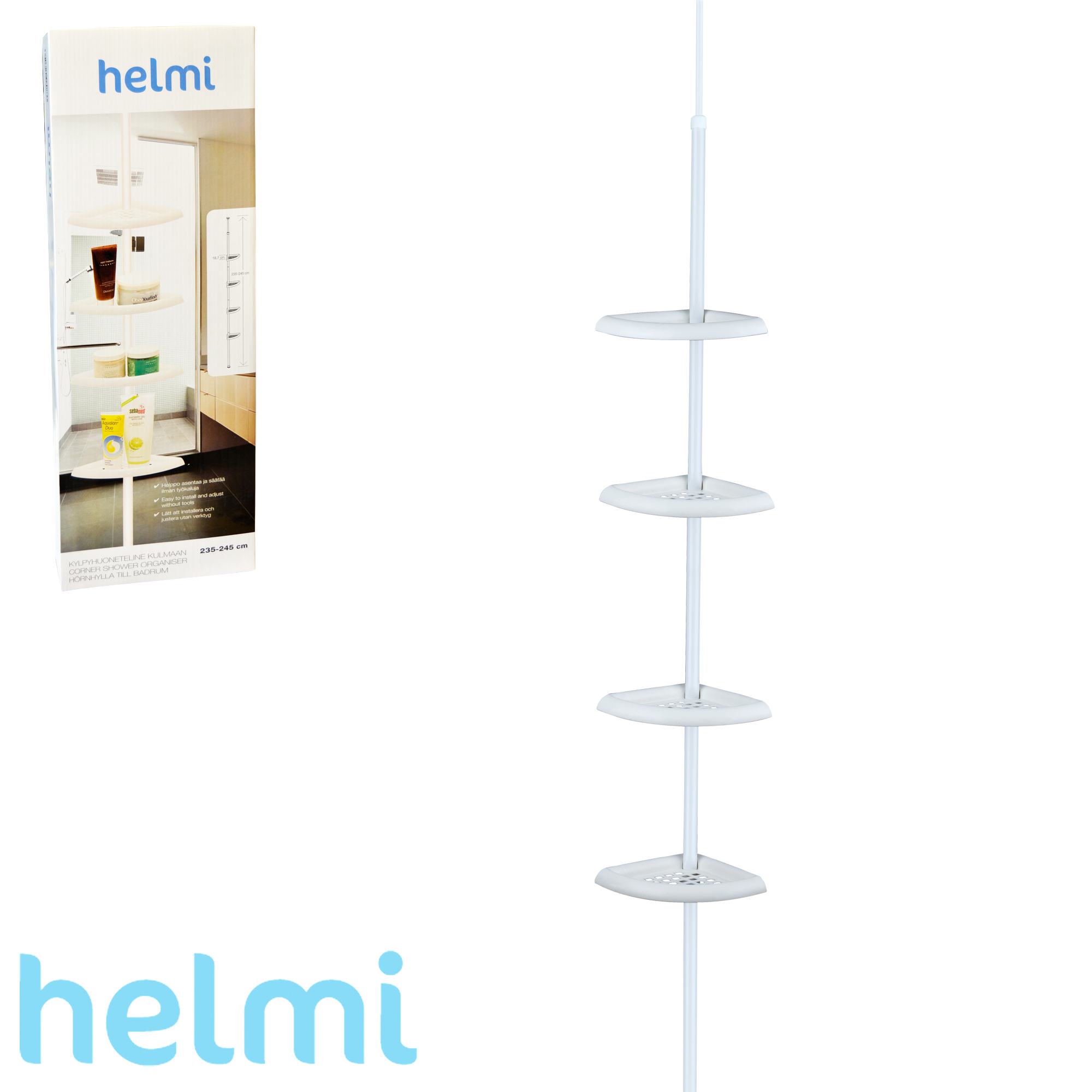 Nurkkaan sijoitettava suihkuhyllykkö. Säädettävä korkeus 235–245 cm.
