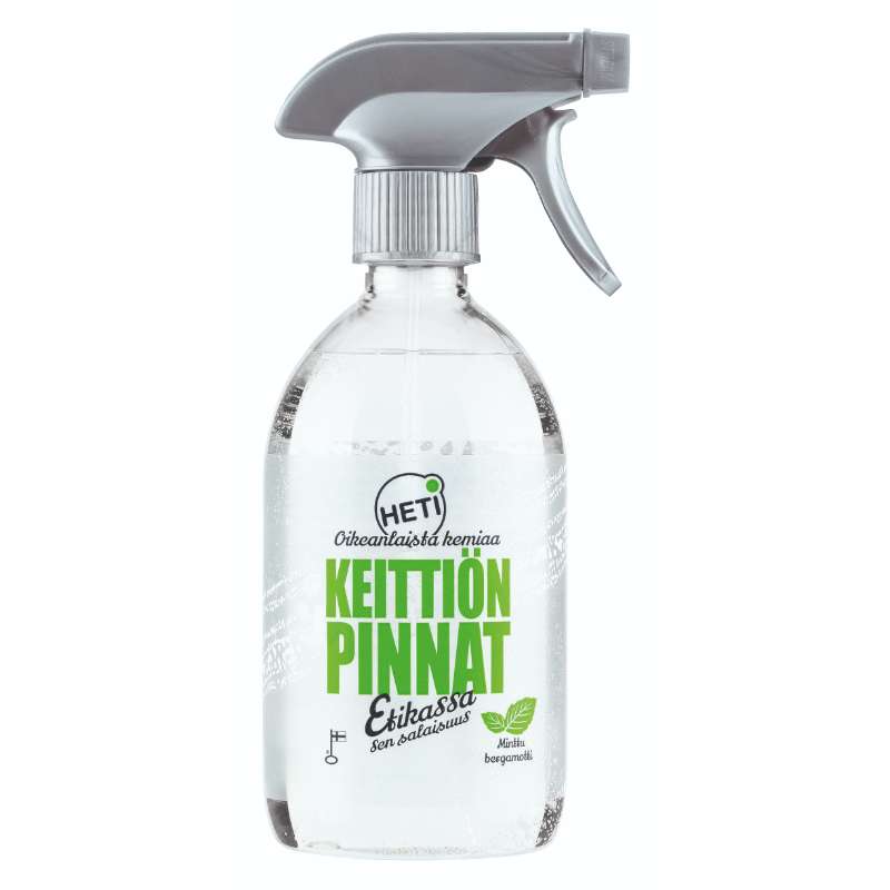 Keittiönpintojen puhdistukseen kehitetty käyttövalmis, etikkapohjainen HETI-pesuaine on kiireisen arkisiivoojan pelastus. Suihkauta ja pyyhi – saat rasvan ja lian helposti pois työtasoilta, liedeltä, tiskipöydältä ja kaapinovista. HETI-puhdistusaine poistaa tehokkaasti myös sormenjäljet rosteripinnoilta.