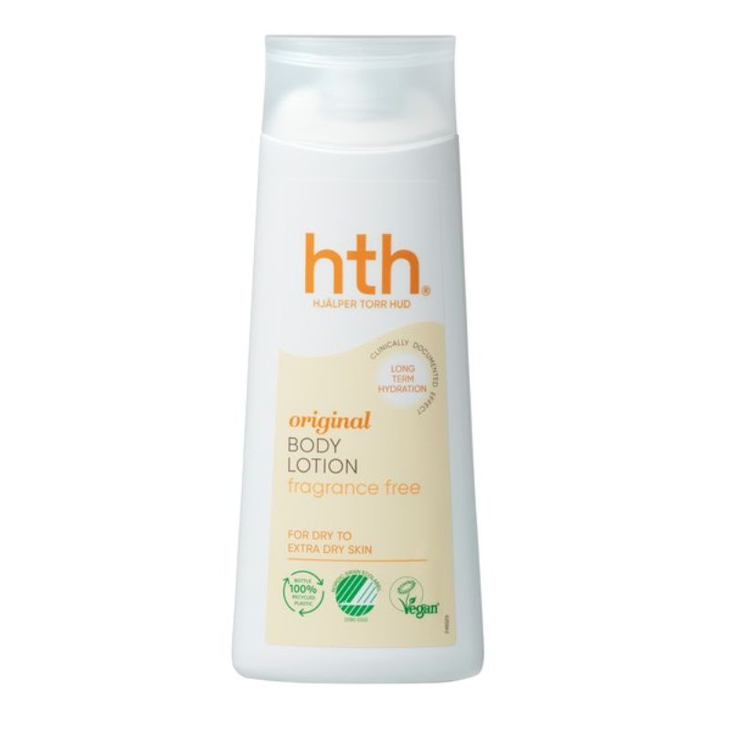 HTH Orginal Body Lotion on miellyttävän hoitava ja pitkään kosteuttava vartalovoide kuivalle iholle. Voide sisältää ihon omia kostettavia aineita – karbamidia, maitohappoa ja betaiinia. Ihosta tulee nopeasti pehmeä ja joustava. HTH Orginal Body Lotion on ollut kuivan ihon pelastaja jo vuodesta 1970. Sen on tieteellisesti todettu auttavan kuivaa ihoa. Hajusteeton. Dermatologisesti testattu ja sopii myös atooppiselle iholle.