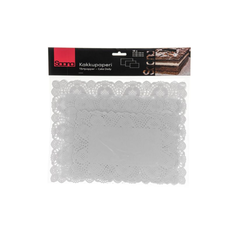 Suorakaiteen muotoinen kakkupaperi tuo tarjoiluun lisää tyylikkyyttä. Kakkupaperi laitetaan tarjottavan ja tarjoilualustan väliin, suojaamaan sekä koristamaan tarjotinta.