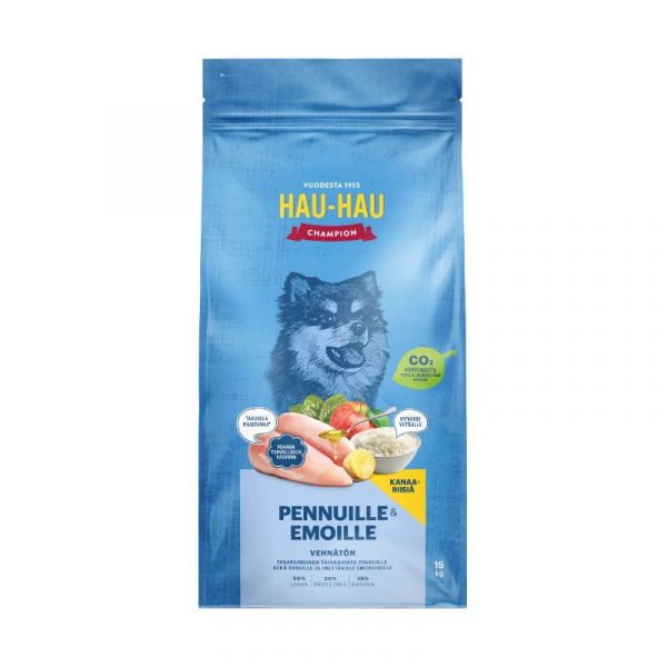 Hau-Hau Champion Kanaa & riisiä pennuille ja emoille on erittäin laadukas ja lihapitoinen koiran kuivaruoka, joka on suunniteltu kasvavan koiranpennun sekä tiineen nartun ja imettävän emon erityistarpeisiin. Maistuva, terveellinen ruoka on jokakoiranoikeus pennusta aina seniori-ikään saakka. Tämä penturuoka sisältää kaikki koiranpentusi tarvitsemat ravintoaineet tasapainoisessa suhteessa ja auttaa emoa ravitsemaan pentujaan sekä tukemaan niiden kehitystä jo sikiövaiheesta lähtien.