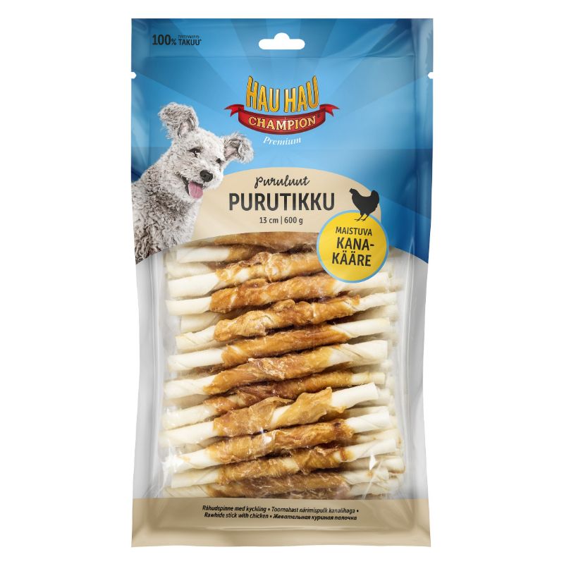 Hau-Hau Champion kanapurutikku on naudannahkainen puruluu, joka on päällystetty herkullisella kanafileellä. Se maistuu nirsollekin koiralle. Puruluutikku fileen sisällä edistää hampaiden hyvinvointia, sillä mekaaninen hankaus koiran purressa tikkua, voi poistaa plakkia. Purutikun ympärille kääritty kanafilee maistuu herkulliselta ja tekee puruluusta maistuvamman.