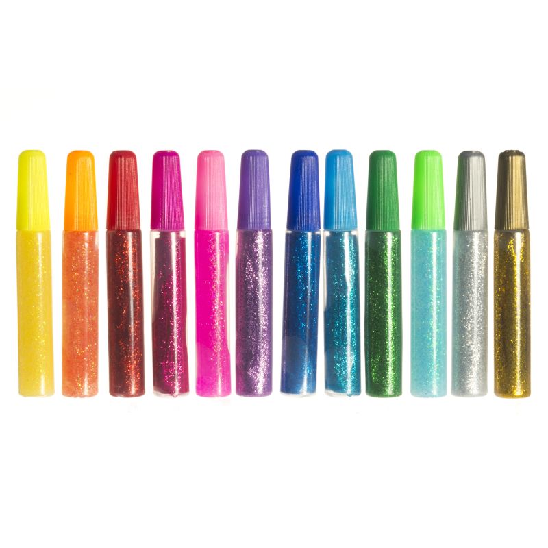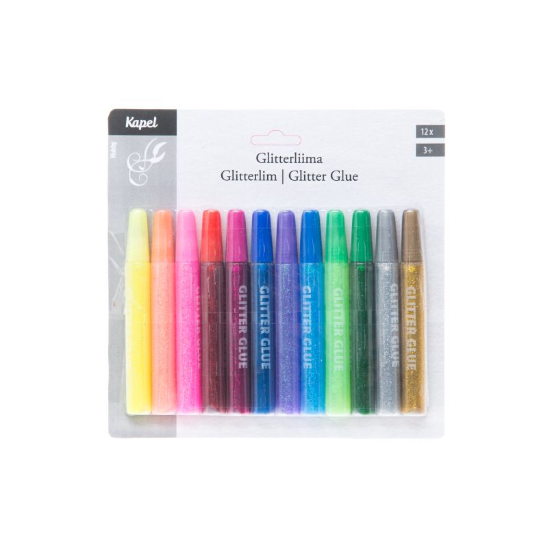 Glitterliima sopii erinomaisesti korttien ja muiden paperiaskartelun koristeluun. Pakkauksessa 12 eri väriä, 10,5 ml (11,7 x 1,5 cm). 3+.