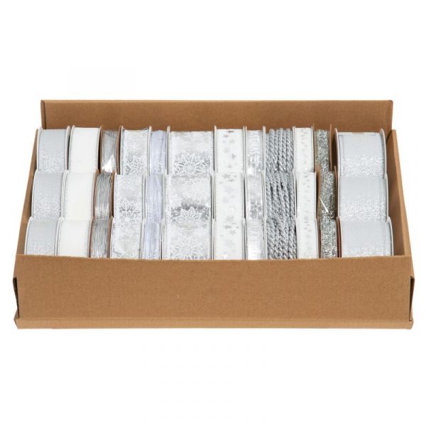 Lajitelma erilaisia hopeisia nauhoja. Nauhojen leveys ja pituus vaihtelevat. Toimitus sisältää yhden rullan. Mallia ei voi valita tilatessa, vaan toimitus varastotilanteen mukaan.
