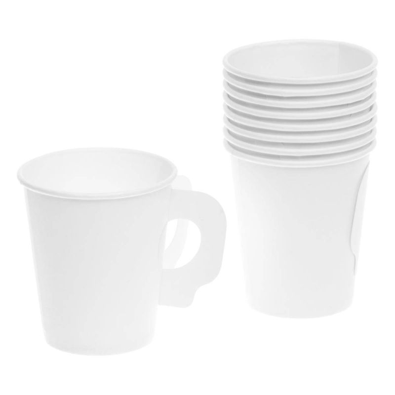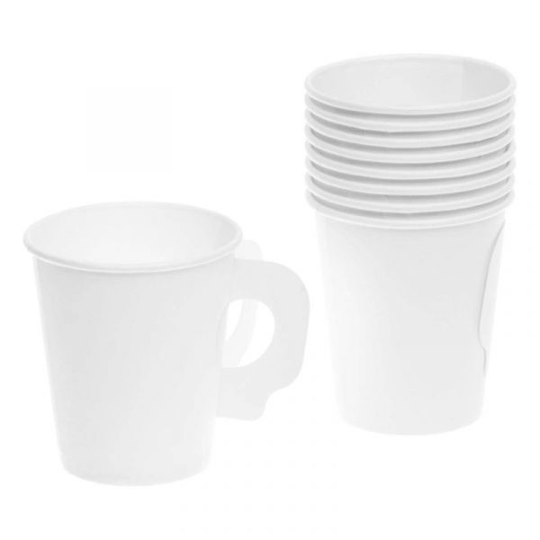 Perinteinen valkoinen pahvimuki on kertakäyttöiseen tarkoitukseen suunniteltu muki.