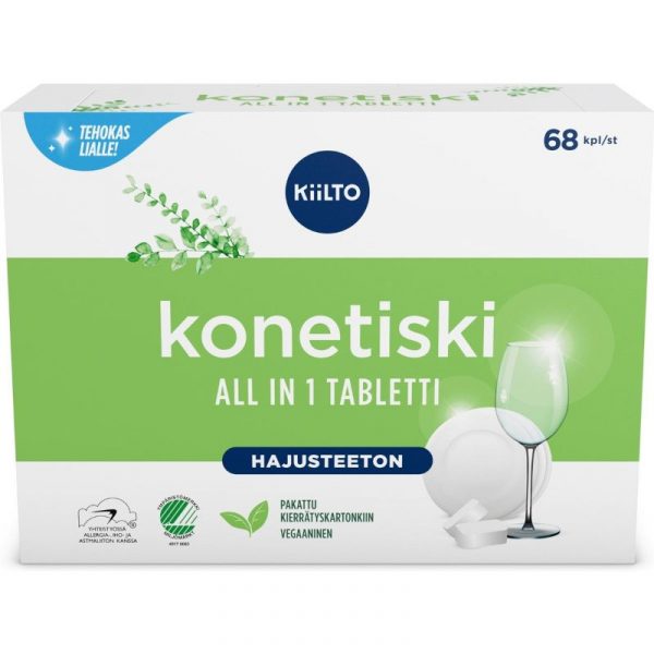 Kiilto Hajusteeton Konetiskitabletissa on kaikki tarvittava yhdessä tabletissa. Ympäristöystävällinen tabletti pesee astiat tehokkaasti, suojaa lasien pintaa ja sisältää myös huuhtelukirkasteen.