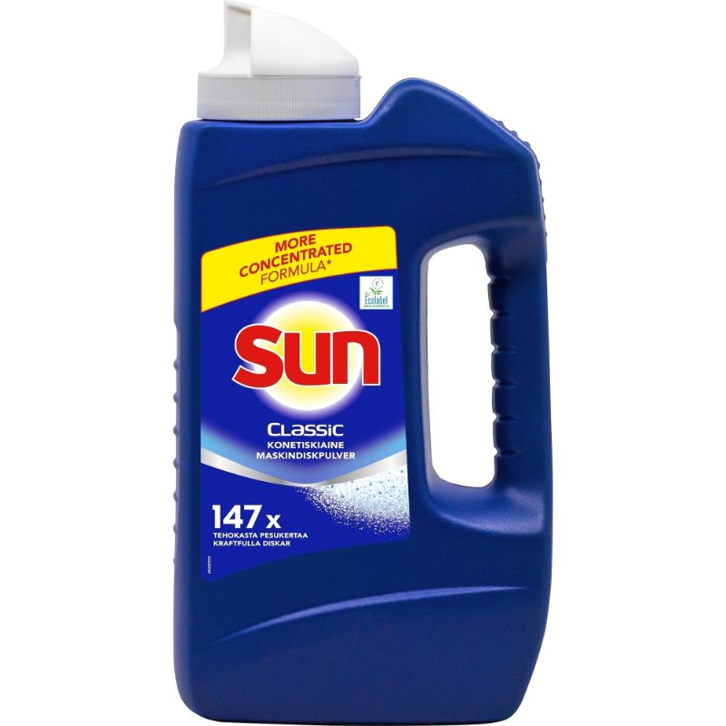Käytä Sun Classic konetiskijauhetta astioiden täydelliseen puhdistukseen. Uusi, entistä tiiviimpi ja tehokas EU-ympäristömerkitty koostumus antaa erinomaisen pesutehon jo 50 °C:ssa ja jopa 93 % enemmän pesukertoja pakkausta kohti verrattuna aikaisempaan koostumukseen. Parhaan lopputuloksen saavuttamiseksi yhdistä Sun Classic -jauhe Sun Classic -huuhtelukirkasteeseen ja Sun Classic -suolaan.