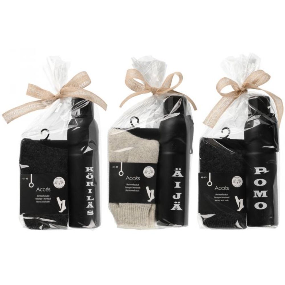 - Sisältää tekstillisen juomapullon (750 ml) ja miesten yhdenkoon merinovillasukat (koko 41-45).