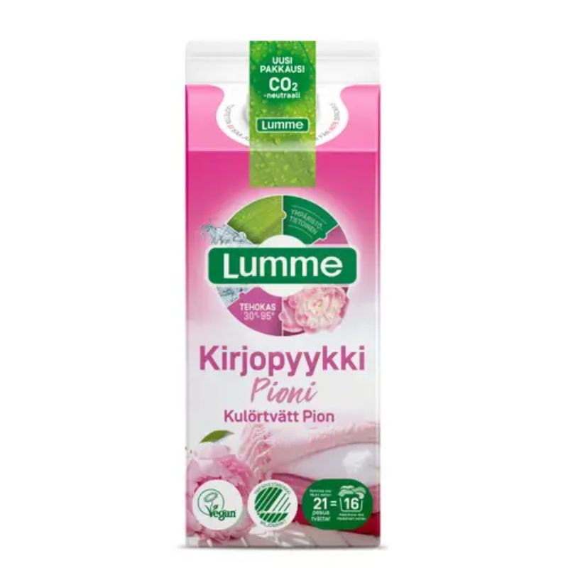 - Lumme Kirjopyykki Pioni on hellävarainen pyykin väreille ja tehokas jo 30 °C:ssa.