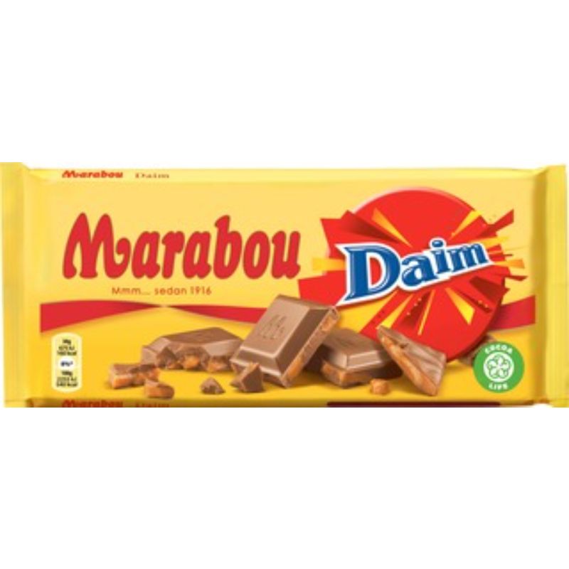 Marabou Daim -suklaalevyssä yhdistyy kaksi suurta suosikkia! Klassinen maitosuklaa ja herkullisen rapea Daim-krokantti, joka tekee suklaasta vastustamattoman. Marabou on Ruotsissa vuonna 1916 perustettu suklaatuotemerkki, jonka tuotteet ovat jo sukupolvien ajan tuoneet iloa ja herkullisuutta perheiden arkeen ja juhlaan. Nauti suklaasta perheen ja ystävien kanssa tai vietä oma nautinto hetki. Kaikki Marabou suklaat ovat 100% vastuullisesti Cocoa Life -tuotettuja. Cocoa Life on oma maailmanlaajuinen vastuullisuusohjelmamme.