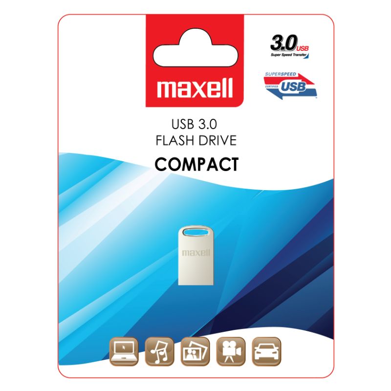 Maxell USB 3.0 Compact on pienikokoinen, metallinen ja nopea USB 3.0 -muisti. Tämä on niin pieni, että mahtuu kätevästi vaikka avainnippuun! Omiaan esimerkiksi autostereoissa, joissa kompakti muisti on huomaamaton.