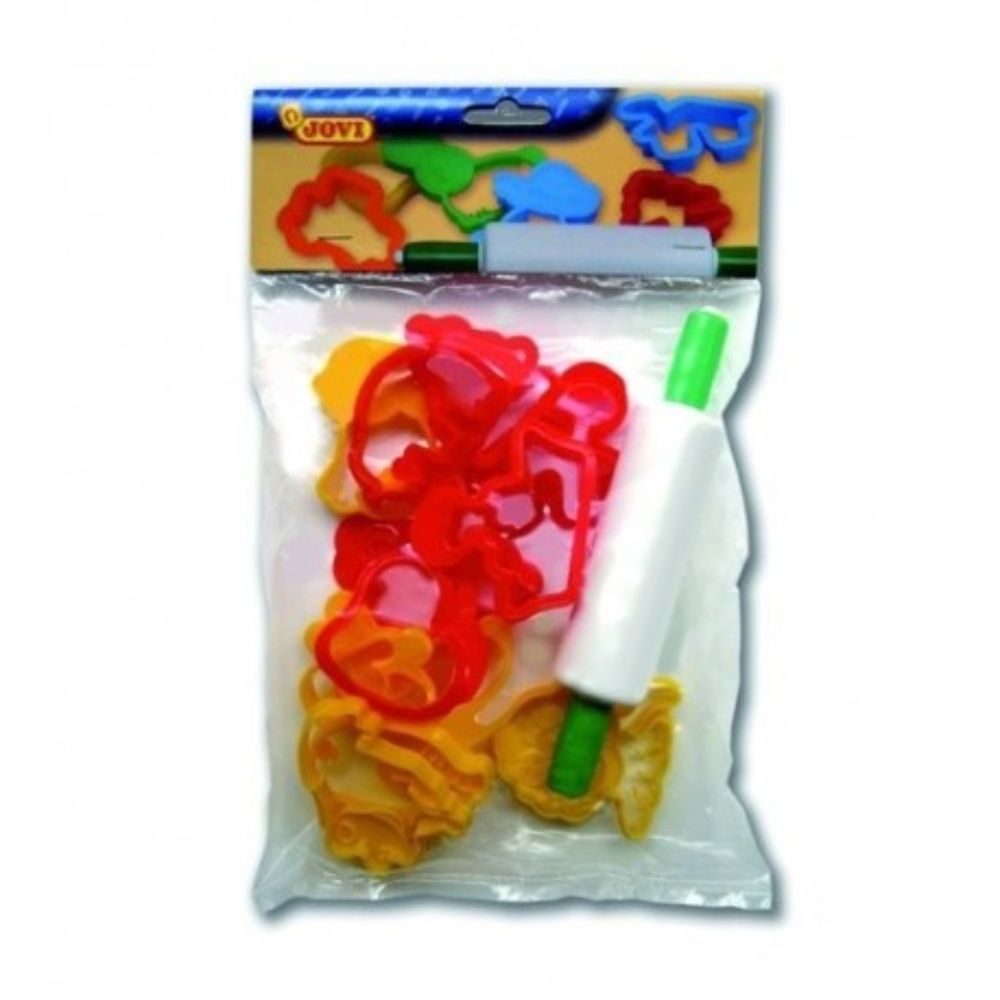 Muovailutarvikkeita pussissa. Sisältää: 6 kuviota, 6 muottia, 1 kaulin.