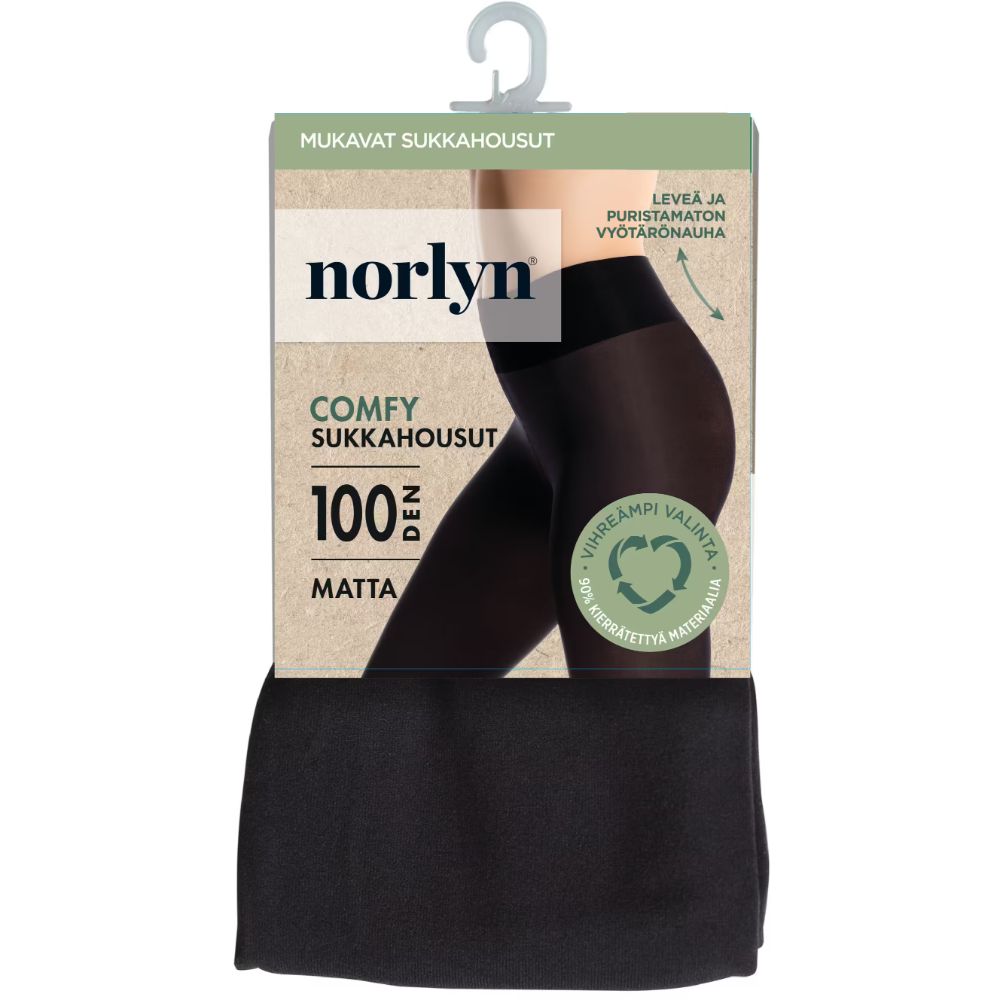 Norlynin mattapintaiset 100 denierin täyspitkät sukkahousut, joissa pehmeä ja leveä vyötärönauha lisäämässä käyttömukavuutta. Sukkahousut ei purista tai rullaannu ja ne antavat sileän siluetin kaikille vartalotyypeille.