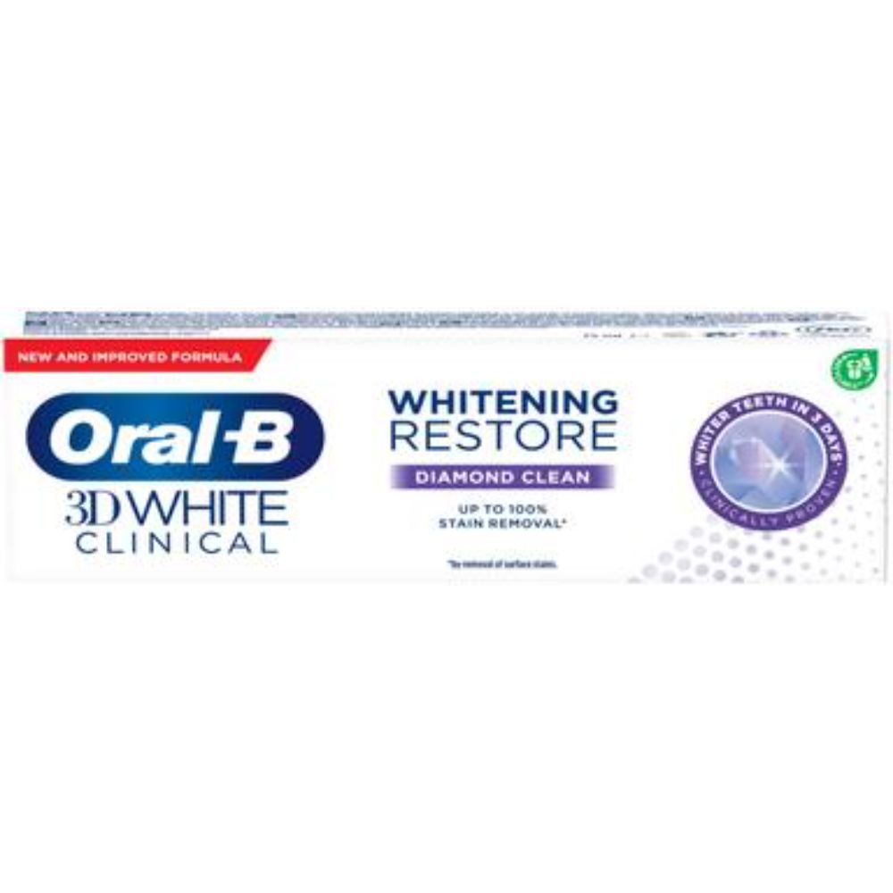 Oral-B 3D White Clinical Whitening Restore Diamond Clean -hammastahna – kliinisesti tutkittu, Oral-B:n asiantuntijoiden suunnittelema. Poistaa jopa 100 % pinnallisista värjäytymistä kolmessa päivässä. Neljä valkaisutoimintoa: irrottaa, poistaa, kiillottaa ja suojaa uusien pinnallisten värjäytymien muodostumiselta.