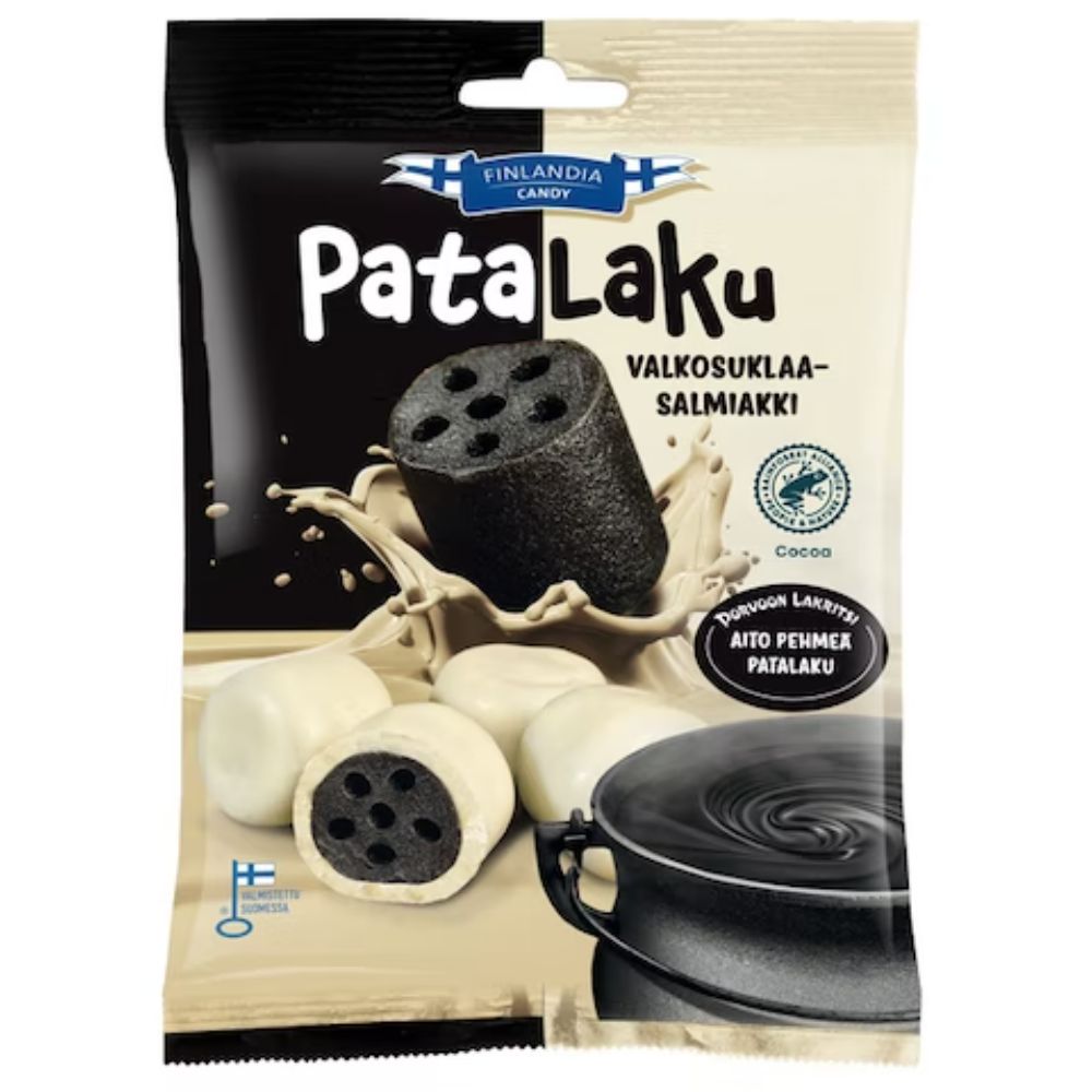- Patalaku valkosuklaa-salmiakki on pitkään padassa keitetty, aito, pehmeä, Porvoon Lakritsi patalaku salmiakki, joka on kuorrutettu Rainforest Alliance seritifioidulla korkelaatuisella suklaalla.
