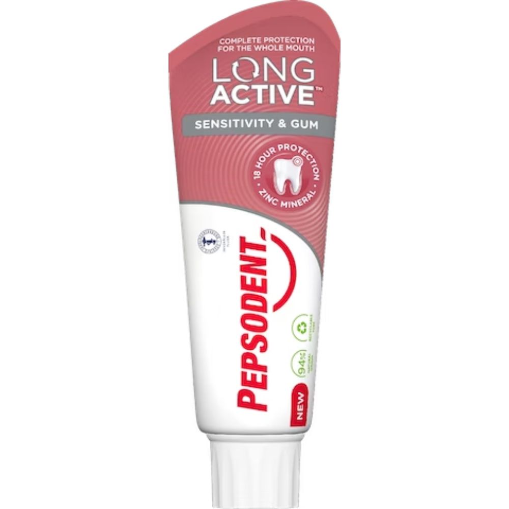 Pepsodent Long Active Sensitivity & Gum on hellävarainen hammastahna, joka valmistetaan 96 %:sesti luonnollisista ainesosista. Tervet hampaat, ikenet ja koko suu. Kaksoisvaikutus: Nopea karieksen lievitys kaliumilla. Hammastahnan koostumukseen lisätään enemmän sinkkiä, joka on luonnollista alkuperää oleva antibakteerinen aine. Sinkki auttaa torjumaan bakteereja ja parantaa suun terveyttä. Pepsodent Sensitivity & Gum vahvistaa ikeniä ja auttaa vähentämään plakin aiheuttamaa ikenien ärsytystä. Pepsodent Long Active Sensitive & Gum -hammastahnalla on kliinisesti todistettu teho suun bakteereja vastaan. *In vivo -tutkimus: suun bakteerien väheneminen hampaissa, poskissa, ikenissä ja kielessä 14 ja 28 päivän käytön jälkeen.