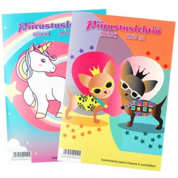 Piirrustuslehtiö värikkäällä kuosilla on kooltaan A5 eli n. 21 cm pitkä ja n. 15 cm leveä. Näppärän kokoinen piirrustuslehtiö sisältää 30 paperiarkkia, jotka voi halutessaan helposti irroittaa lehtiöstä. Piirrustuslehtiö on helppo kuljettaa repussa, laukussa tai autossa mukana kompaktin kokonsa ansiosta. Lajiltelmaan kuuluu 2 värikästä kuosia, toisessa kuosissa on yksisarvinen ja toisessa kaksi koiraa.