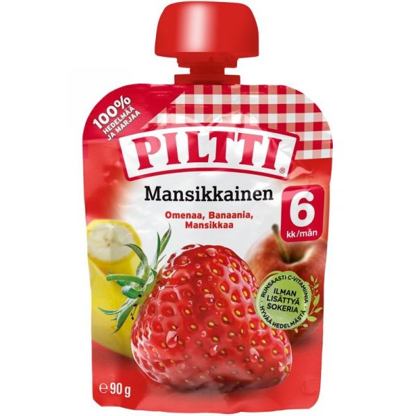100% hedelmää. Piltti Mansikkainen-annospussi on maistuva ja kätevä välipala
