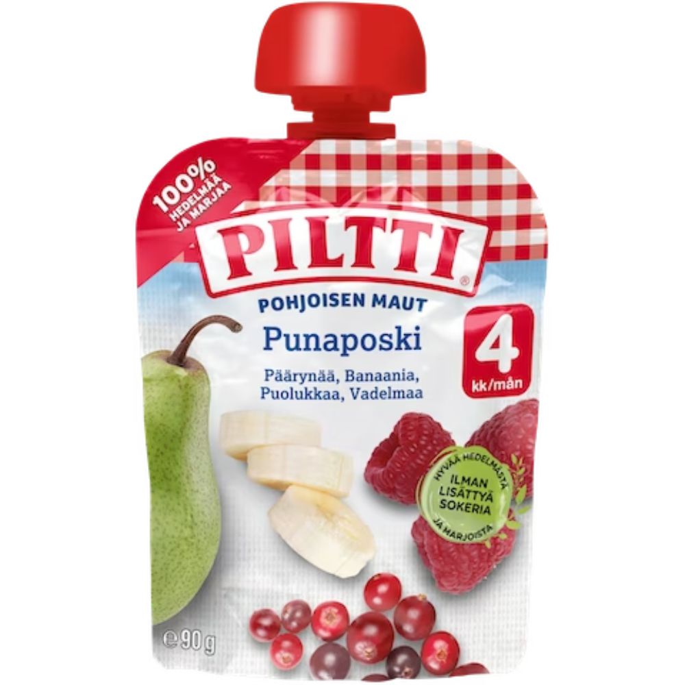 PILTTI Pohjoisen Maut Punaposki on raikas hedelmä-marjasose päärynästä, banaanista, puolukasa ja vadelmasta, 100% hedelmää ja marjaa. Ei lisättyä sokeria tai makeita mehutiivisteitä. Sopii välipalaksi tai jälkiruoaksi lapsille 4 kuukauden iästä alkaen.