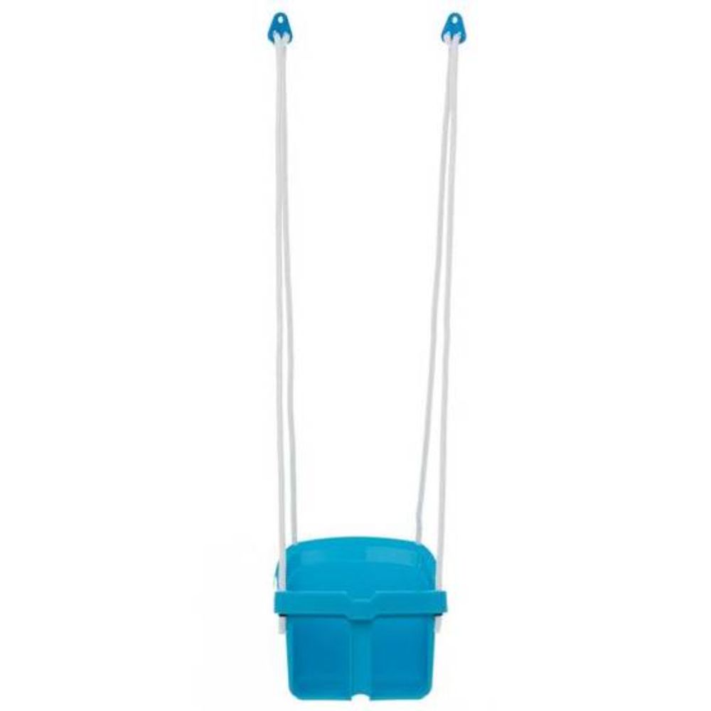 Muovinen sininen lastenkeinu sisä- ja ulkokäyttöön, jossa on mukana ripustusköysi.