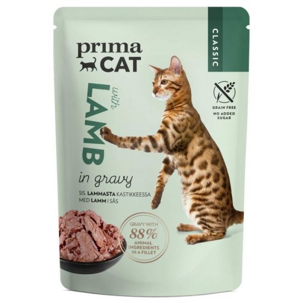 PrimaCat Lammasta kastikkeessa -annospussit pitävät huolta siitä, että kissasi saa kaikki tarvitsemansa ravintoaineet helposti houkuttelevassa muodossa. Annospussissa on puolet täyteläistä kastiketta, puolet maukkaita lampaanmakuisia lihasuikaleita. Pakkauksesta et löydä mitään ylimääräistä, sillä reseptimme on sokeriton ja viljaton, eikä se sisällä maissia, soijaa tai geenimuunneltuja ainesosia. Nämä ominaisuudet tekevät Classic-kissanruoistamme ainutlaatuisia täysravintoja markettien kissanruokahyllyssä.