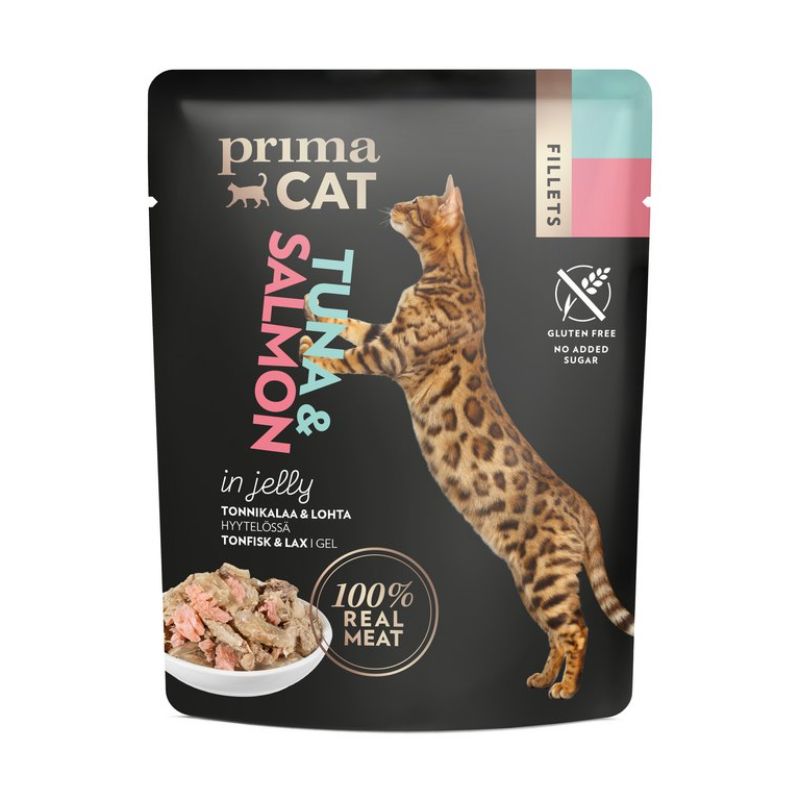 PrimaCat Fillets Tonnikalaa ja lohta hyytelössä sisältää runsaasti proteiinia ja vain laadukkaimpia raaka-aineita rakkaalle kissallesi. Fillets-kissanruoka on 100 % luonnollisista raaka-aineista valmistettu maistuva täydennysravinto, joka sisältää herkullisen sekoituksen täyteläistä tonnikalaa ja mehevää lohta, joiden sisältämät omega-rasvahapot tukevat kissasi turkin ja ihon hyvinvointia. Kissalle tärkeän proteiinin lisäksi annospussi sisältää pienen määrän riisiä, jonka kuidut tukevat kissasi vatsan toimintaa.