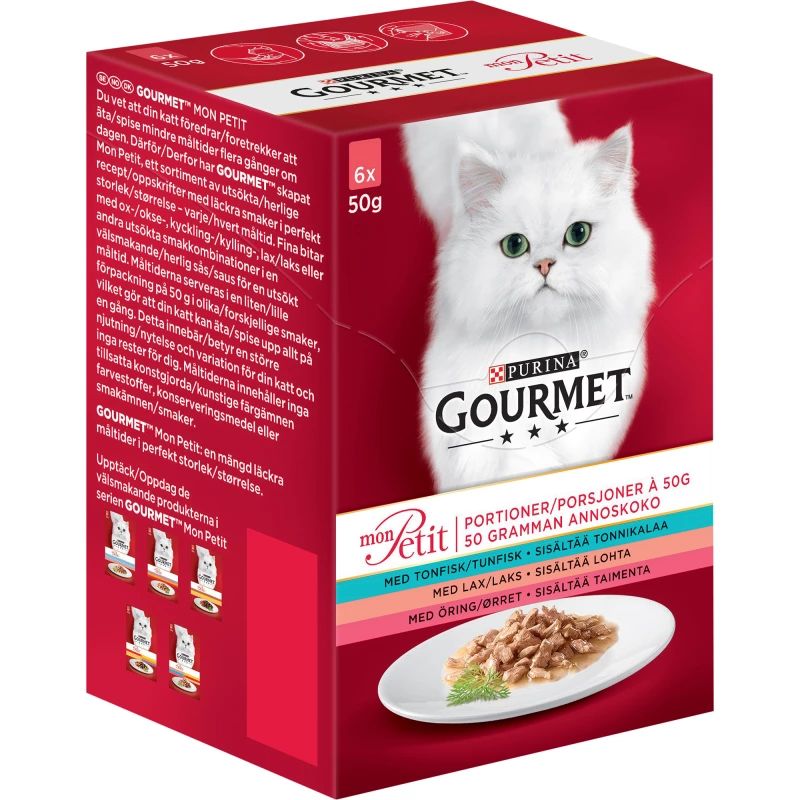 Gourmet Mon Petit Duo on ainutlaatuinen märkäruoka täysikasvuisille kissoille. Se perustuu tasapainoiseen ja kattavaan reseptiin, josta kissasi saa kaikki tarvitsemansa ravintoaineet, vitamiinit ja kivennäisaineet. Aromaattisista kalasuikaleista tehdyt luomukset ilahduttavat kissoja.