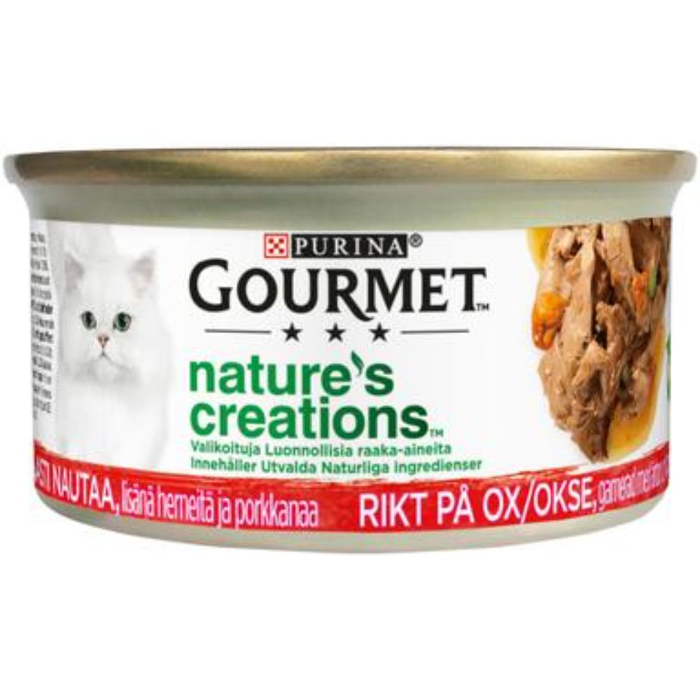 GOURMET Nature’s Creations on valikoima herkullisia, luonnon inspiroimia reseptejä. Huolella valmistetut ruoat sisältävät laadukkaita luonnollisia raaka-aineita, jotka on valmistettu asiantuntemuksella ja sisältävät runsaasti nautaa, lammasta, siipikarjaa tai kalaa sekä lisänä kasviksia, esimerkiksi pinaattia, porkkanaa tai tomaattia ja riisiä. Jokainen hieno resepti on laadittu niin, että ruoastaan tarkka kissasi nauttii jokaisesta suupalasta. GOURMET™ Nature’s Creations. Hienoja, luonnon inspiroimia aterioita.
