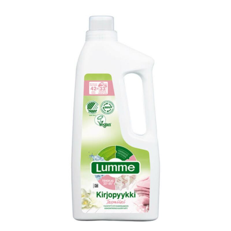 Joutsenmerkitty Lumme Jasmiini on erityisesti suunniteltu kirjopyykille. Se on hellävarainen pyykin väreille pesten silti tehokkaasti alhaisimmissakin lämpötiloissa. Joutsenmerkki tuotteessa tarkoittaa, että sen ympäristövaikutukset on tarkkaan arvioitu ja pesutehon olevan erittäin hyvä myös vaikeisiin tahroihin.