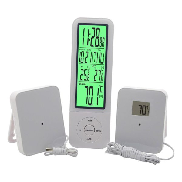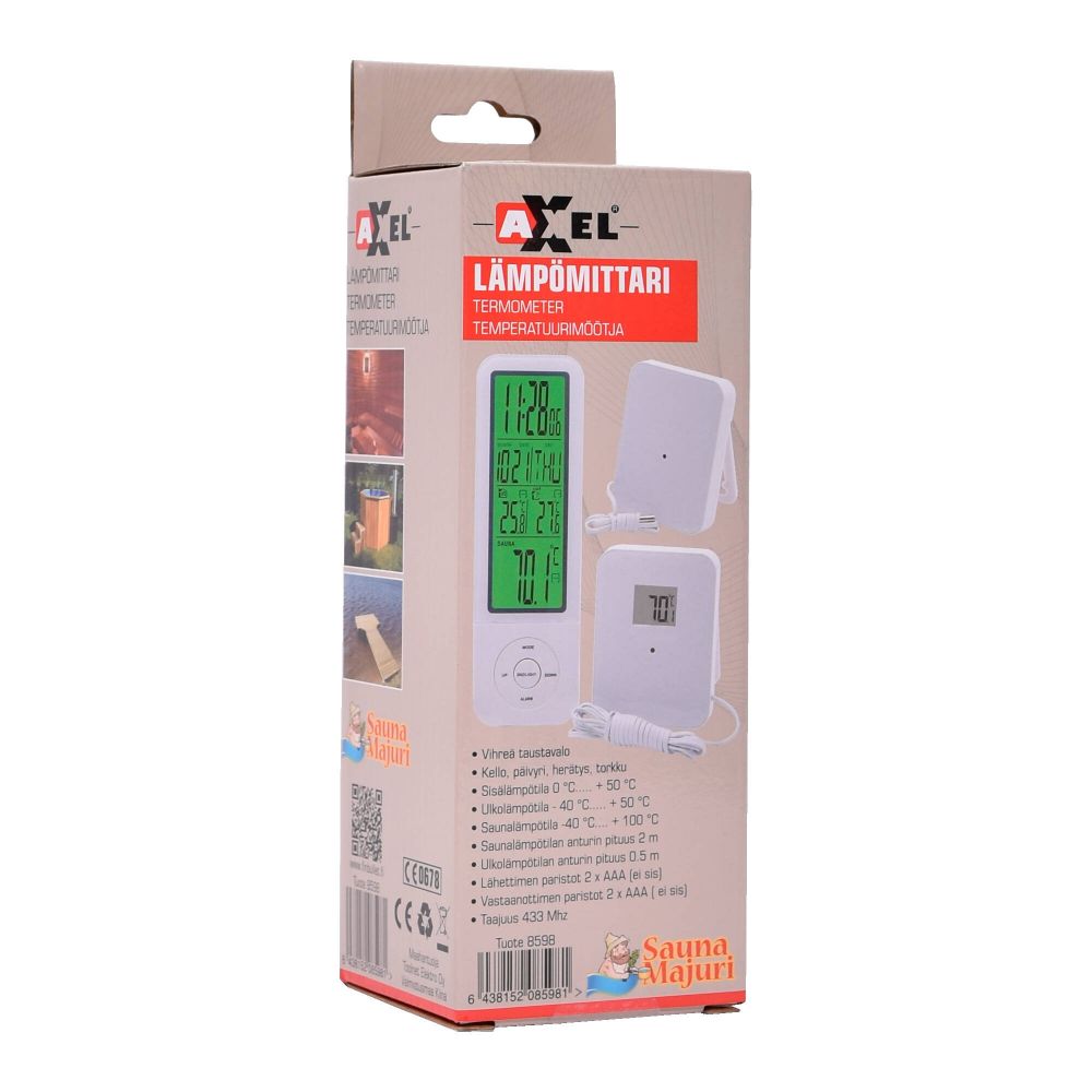 saunan ulkopuolisista tiloista 2 m anturin avulla. Mittari toimii myös kellona, päivyrinä ja herätyskellona, jossa on torkkutoiminto.