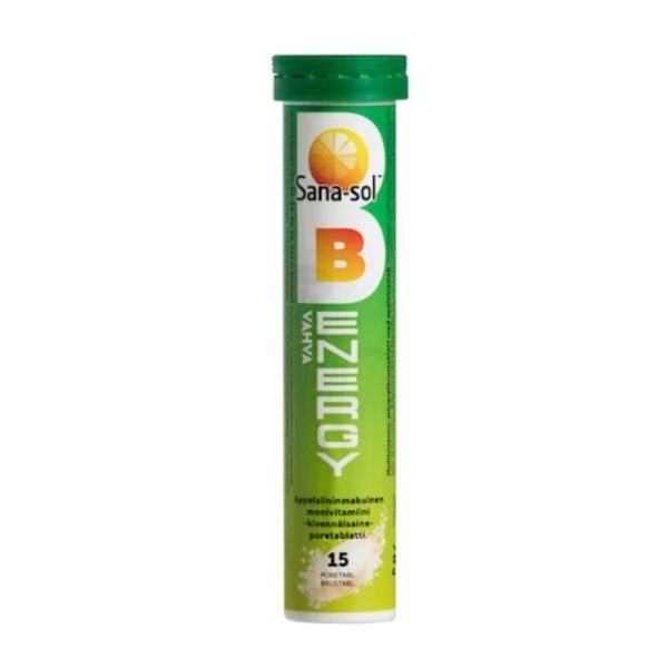 Sana-sol B-Energy on appelsiininmakuinen monipuolinen monivitamiini-kivennäisaineporetabletti. Sana-sol Energy Vahva B-pore sisältää kahdeksaa B-vitamiinia vahvoina pitoisuuksina. Lisäksi siinä on D- ja C-vitamiinia, kalsiumia, magnesiumia ja sinkkiä.