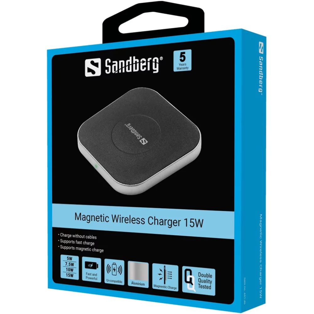 Sandberg Magnetic Wireless Charger on erinomainen pienikokoinen langaton laturi, joka on valmistettu alumiinista ja tarkoitettu Qi-yhteensopiville älypuhelimille. Laturi on magneettinen, joten se voidaan liittää magneettista latausta tukeviin älypuhelimiin (esimerkiksi iPhone 12/13).